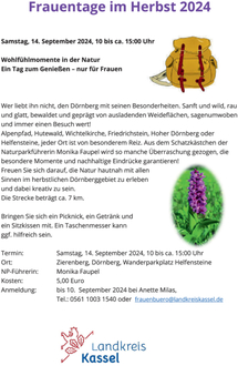 Los geht es am Samstag, 14. September, um 10 Uhr mit einer Wanderung nur für Frauen. Unter dem Titel „Wohlfühlmomente in der Natur: Ein Tag zum Genießen“ zeigt Naturparkführerin Monika Faupel die herbstlichen Naturschätze des Dörnberggebiets. Die Strecke beträgt etwa sieben Kilometer, Teilnehmerinnen werden gebeten, festes Schuhwerk, Verpflegung und ein Sitzkissen mitzubringen. Anmeldung bis zum 10. September bei Anette Milas unter Tel. 0561/1003-1540