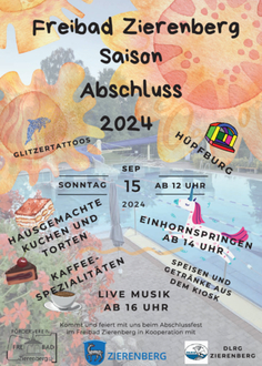 Am 14.09. findet zum ersten Mal ab 20:00 Uhr das Moonlight Schwimmen. Bei beleuchteten Wasser können die Gäste kurz vor dem Saisonende unter besonderer Atmosphäre noch einmal ihre Bahnen ziehen. An diesem Tag besteht die Möglichkeit noch bis Mitternacht das Schwimmbad zu besuchen. Der Eintritt ist gegen eine kleine Spende möglich. Der Förderverein Freibad wird am Abend eine Auswahl an Cocktails anbieten, natürlich auch alkoholfrei. Ja und dann ist die Saison leider schon zu Ende. Das diesjährige Abschlussfest findet am 15.09.24 ab 11 Uhr statt. Es gibt eine kleine Tombola und Livemusik ab 16 Uhr. Der Kiosk bietet an diesem Tag verschiedene deftige Mahlzeiten. Der Förderverein bietet leckere hausgemachte Torten und Kuchen. Zudem gibt es Glitzertattoos und eine Hüpfburg. Als Highlight gibt es noch das erste Einhornspringen im Freibad. Seit gespannt und kommt Vorbei. Wir freuen uns auf euch.