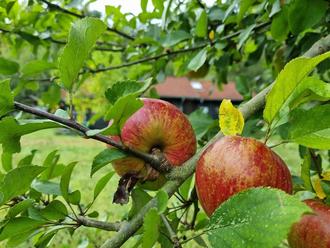 Saftig und rot leuchten die reifen Äpfel der Gewürzluike auf der Streuobstwiese vor der Hummelwerkstatt in Naumburg.