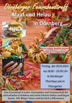 Die Interessengruppe „Bürgergastronomie für Dörnberg“ lädt am 30. Januar zu einer kleinen Karnevalsfeier ein. Wer im Kostüm kommt, erhält ein Freigetränk. Es besteht aber kein Kostümzwang, sondern geselliges Beisammensein und gegenseitiges Kennenlernen stehen im Vordergrund.