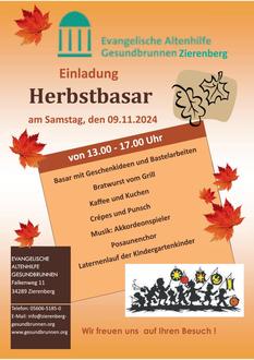 Am Samstag, 9. November, lädt die Evangelische Altenhilfe Gesundbrunnen Zierenberg von 13 bis 17 Uhr in den Falkenweg 11 zu einem Herbstbasar ein.