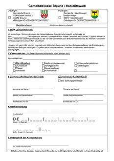 Wenn Sie eine Lastschrift wünschen, füllen Sie bitte das nachstehende SEPA-Lastschriftmandat aus und senden dieses an die Gemeinde Habichtswald oder direkt an die Gemeinde Breuna.