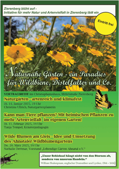 Dieser Entwicklung stellt sich „Zierenberg blüht auf – Initiative für mehr Natur und Artenvielfalt im Warmetal“ entgegen. Zu unserer Vortragsreihe „Naturgärten – ein Paradies für Wildbiene, Distelfalter und Co.“ möchten wir Sie herzlich einladen, denn die Informationen der Vorträge lassen sich auch auf Firmengrünflächen anwenden. Ein naturnahes Betriebsgelände bringt nicht nur dem Biotop- und Artenschutz etwas, es ist auch eine Visitenkarte für ein innovatives, zukunftsorientiertes und nachhaltig denkendes Unternehmen.
