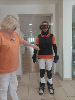An vier Stationen konnten die Mitarbeiter unter anderem den „Alterssimulationsanzug GERT“ testen. Der Anzug beinhaltet eine 10 Kilogramm schwere Weste, Gewichte und Bandagen an den Gelenken, Spezial-Schuhe, Schallschutzkopfhörer, sowie die spezial-Brille mit Sichtfeldeinschränkung. Hiermit Treppen zu steigen, sich zu bücken, einfach nur geradeaus zu laufen oder Hilfsmittel wie einen Rollstuhl oder Rollator zu nutzen – alles eine Herausforderung.
