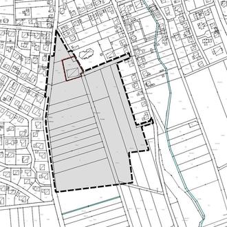 Lageplan zur Abgrenzung des räumlichen Geltungsbereiches (schwarz gestrichelte Linie), genordert, ohne Maßstab: