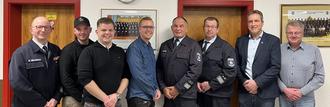 (von links) Zweiter stellv. Stadtbrandinspektor Matthias Brandau, Zweiter stellv. Wehrführer Maurice Dittmar, Wehrführer Fabian Baumann, stellv. Wehrführer Dominik Liehr, Stadtbrandinspektor Joachim Krämer, stellv. Stadtbrandinspektor Norbert Degenhardt, Bürgermeister Rüdiger Germeroth und Stadtrat Richard Leck.