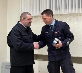 Vereinsvorsitzender Thorsten Schlenke verabschiedet den scheidenden Wehrführer Timm König
