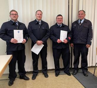 Für 25 Jahre Vereinstreue wurden Karl Beyer, Karsten Gerhold, Stefan Gerhold und Adrian Probst ausgezeichnet. Stefan Gerhold erhielt zusätzlich die Plakette des Kreisfeuerwehrverbandes in Bronze für 25 Jahre aktiven Dienst.
