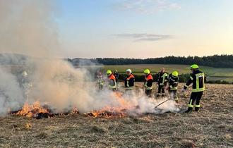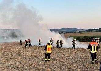 Mit Unterstützung des Landwirts Wilfried Herbst wurde oberhalb des Hainwäldchens auf einem abgeernteten Acker mehrere Stationen vorbereitet, wo verschiedene Arten der Brandbekämpfung simuliert werden konnten. Hierbei kamen nicht nur Löschwasser aus Strahlrohren, sondern auch Löschrucksäcke und auch handgeführte Bodenbearbeitungsgeräte zum Einsatz.