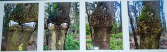 Im Flur des Bürgerhauses gegenüber der Postfiliale sieht man diese Zusammenstellung von Fotos vom sogenannten „Schilderfresserbaum“, der „em Häwäldche en Wohr“ steht.