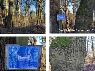Die Fotos über die Veränderungen im Baumstamm stammen von Irmgard Denzel, die bei Spaziergängen diese wahrnahm und fotografisch festhielt. Beim 1. Foto aus dem Anfang der 2000 Jahren links kann man das Schild „Zwischenlagerplatz“ noch erkennen. In den laufenden Jahren bis 2018 (letztes Foto rechts) verschwand das Schild immer mehr im „Maul“ des Baumes. Die Fotos der unteren Zusammenstellung wurden am 9. Jan. 2024 gemacht. Wie unschwer zu erkennen ist, hat der Baum das Schild vollständig gefressen. So entstand auch der Name „Schilderfresserbaum“ der vielen „Worschen“ nicht unbekannt ist. Heute weist ein von Wilhelm Groll aus dem Jahr 2007 stammendes Foto, das an einem Pfosten angebracht ist, auf den Zwischenlagerplatz von Steinen hin. Die Veränderungen am Baumstamm im Laufe der Jahre zeigen auf, dass der Baum mit einem Gesicht (ein Auge und ein Maul) lebt und dieser das Schild im wahrsten Sinne gefressen hat. Das ist ein kleines Zeichen dafür, dass die Natur bei Ein- und Angriffen von Menschen sich wehren und letztlich die Ein- und Angriffe abwehren und besiegen kann.