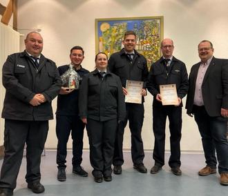 Nach der Ergänzungswahl der Kassenprüfer wurden Beförderungen und Ehrungen durchgeführt. Zum Hauptfeuerwehrmann wurden Alexander Block und Jan Bornmann befördert. Maxim Froncek wurde für die meisten Teilnahmen an Einsatz- und Übungsdiensten geehrt.