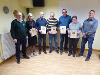 Die Geehrten für Vereinszugehörigkeit (v. l. n. r.): 1. Vorsitzender Gerhard Paesler, Marion Reich, Helmut Schmidt, Hilmar Schleiter, Jörg Gücker, Sarah Kren, 2. Vorsitzender Klaus Manhenke.