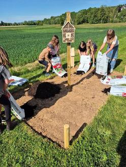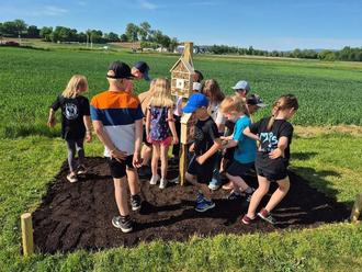 Als gemeinsame Umweltaktion in allen vier Tatzen/ Altersstufen, haben die Kinder am Feuerwehrhaus eine Wildblumenwiese angelegt und Insektenhotels aufgehangen.