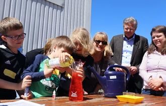 Kinder aus dem Betreuungsangebot zeigen dem Ersten Kreisbeigeordneten Peter Neidel ein Experiment zur Herstellung von Flüssigkeit für eine Lavalampe. (Fotos: Maximilian Schlick/Landkreis Marburg-Biedenkopf