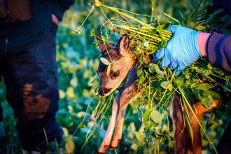 Vorsichtig wird das kleine Kitz aus dem Feld getragen. (Fotos: Wildtierrettung Langendorf)