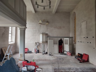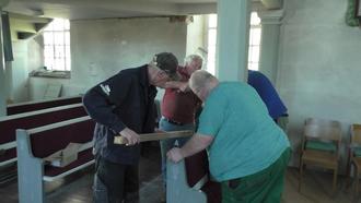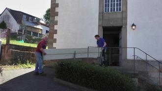 Am Vortag wurden von „Männern vom Fach“ die fest verankerten Bänke vom Boden gelöst und in eine benachbarte ehemalige Scheune zur Aufbewahrung getragen. Auch die Heizungsrohre am Fußboden und an den Fenstern wurden gelöst und entfernt. Der schwergewichtige Altar fand vorerst auch seinen Platz in der ehemaligen Scheunentenne.