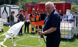 Vorbeugende Maßnahmen gegen die „Afrikanische Schweinepest“: Wilfried Eucker vom GABC-Zug des Landkreises demonstriert Teile der Desinfektionsanlage an der Kläranlage in Biedenkopf-Wallau. Mit dieser Anlage können Fahrzeuge desinfiziert werden. (Fotos: Maximilian Schlick/Landkreis Marburg-Biedenkopf)