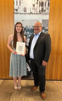 Emily Schülke und Bürgermeister Heiko Dawedeit bei der Zeugnisvergabe in Gießen.