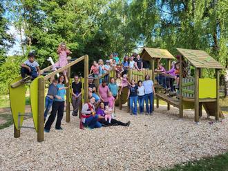 Viele helfende Hände und glückliche Gesichter – das ehrenamtliche Team auf dem neuen Spielturm.