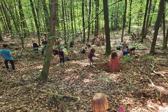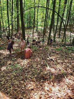 Zum Schluss der Woche ging es in den Wald, wo unserer Förster Daniel Hoven mit den Kindern eine Murmelbahn nur mit Gegenständen aus dem Wald baute.