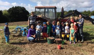 Doch nicht nur in die unterschiedlichen Lernbereiche können sich die Kinder freiwillig und selbstbestimmt einwählen, sondern auch zu Ausflügen und Aktionen. So standen schon Naturtage und eine Einladung zum Kartoffel ernten auf dem Plan. Zum Kartoffel ernten hat uns, wie schon im letzten Jahr, die Familie Flörke eingeladen. 13 Kinder machten sich mit zwei Erzieherinnen in der letzten Woche auf den Weg zum Kartoffelacker. Dort besprach Phillip Flörke mit den Kindern, was man wohl alles aus Kartoffeln machen kann. Mit Traktor und Grubber ist er dann übers Feld gefahren. Der Grubber hat die Kartoffeln nach oben ausgeworfen. Phillip, Sonja und Julia haben dann mit den Kindern die Kartoffeln aufgelesen. Der kleine Mats, Phillips und Julias Sohn, lag solange im Kinderwagen und wird dann vielleicht beim nächsten Mal auch schon mithelfen. Insgesamt wurden vier Reihen Kartoffeln gelesen. Alle Kinder haben beim Lesen gut durchgehalten und hatten viel Spaß, was sicher auch daran lag, dass sie sich bewusst und freiwillig für diese Aktion einwählen konnten. Die Kinder haben kleine Eimer mit den Kartoffeln gefüllt und durften diese mit in die Kita nehmen. In der nächsten Woche wollen wir dann Kartoffeln kochen und mit Butter genießen oder Kartoffelbrei und Kartoffelchips selbst herstellen.