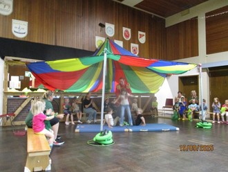 Frau Schaller begrüßte zu Beginn des Festes alle Beteiligten. Es gab um 16 Uhr einen Auftritt zum Zirkusprojekt vom Sommer mit Sandra Häberle, die diesen im Vorfeld mit den Kindern geprobt hatte.