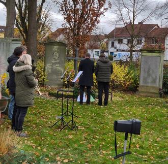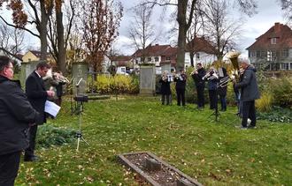 Die Gedenkstunde wurde auf dem Ehrenfriedhof fortgeführt. Der Posaunenchor der evangelischen Kirchengemeinde Wolfhagen sorgte für musikalische Begleitung neben dem Ehrenmal, bevor Bürgermeister Dr. Dirk Scharrer die diesjährige Gedenkrede hielt.