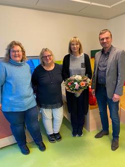 Herzliche Glückwünsche an Gudrun Tripp (2. v. r.) zum Abschied aus dem Berufsleben durch Bürgermeister Dirk Scharrer, Kita-Leiterin Karin Döring (2 v.l.) und Personalratsvorsitzende Carina Herbold.
