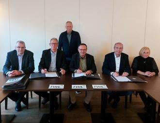 vlnr. Jörg Fritz (Geschäftsführer TWL GmbH), Roman Rein (Geschäftsführer TWL GmbH), Norbert Müller (Aufsichtsratsvorsitzender TWL GmbH), Helmut Harth (Bürgermeister Losheim am See), Michael Dewald (Geschäftsführer energis GmbH), Anke Klein (Prokuristin energis GmbH).