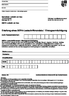 Sie möchten der Gemeinde Losheim am See eine SEPA Einzugsermächtigung zum automatischen Einzug Ihrer Steuern und Abgaben zu den Fälligkeiten 15.02./15.05./15.08./15.11. eines Jahres erteilen? Bitte füllen Sie hierzu das unten stehende Formular unter Angabe von sämtlichen gewünschten Kassenzeichen aus und geben Sie es bitte im Rathaus, Merziger Straße 3, 66679 Losheim am See ab oder senden Sie es per Mail an gemeindekasse@losheim.de. Bei Fragen setzen Sie sich gerne mit der Gemeindekasse unter den Telefonnummern 06872/609 -135 oder -136 in Verbindung. Vielen Dank für Ihre Unterstützung!