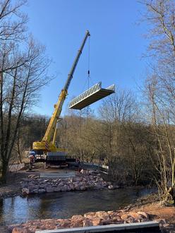 „Unsere neue Brücke ist 14,5 Meter lang und 3,2 Meter breit“, erklärt Bürgermeister Helmut Harth. „Für ein Bauwerk dieser Größe handelt es sich dabei um ein echtes Leichtgewicht mit möglichst sparsamen Materialeinsatz, für dessen Montage aber dennoch ein Schwerlastkran benötigt wurde. An dieser Stelle mein herzlicher Dank an das Team rund um Bauleiter Karl Thome und unsere Bauamtsmitarbeiter, durch deren ausgezeichnete Vorarbeiten und sehr gute Abstimmung das Aufsetzen auf die Widerlager reibungslos und in einer Rekordzeit von unter 10 Minuten erfolgen konnte. Entgegen einiger Befürchtungen in den Sozialen Medien ist die Durchfahrtsbreite der Konstruktion mit 2,5 Metern übrigens vollkommen ausreichend für die üblichen Einsatzfahrzeuge der Feuerwehr und des Rettungsdienstes. In erster Linie handelt es sich bei der Brücke aber selbstverständlich um einen Überweg für Fußgänger und Radfahrer.“