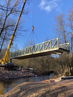 Am 28. Februar war es dann soweit: Die neue Brücke aus pulverbeschichtetem und somit witterungsbeständigem Aluminium kam in den Morgenstunden per Schwerlast-Transporter an ihrem Bestimmungsort an. Ein Spezialunternehmen aus Österreich hatte die Brücke im heimischen Werk komplett fertiggestellt, um eine längere Montagezeit am Stausee zu vermeiden und so machte sich die 3,4 Tonnen Konstruktion in der Nacht von Montag auf Dienstag auf ihre rund 500 Kilometer lange Reise ins Saarland. Rund 190.000 Euro kostet die Brücke samt Einbau. Finanziell unterstützt wurde die Gemeinde Losheim am See bei dieser Investition durch das Ministerium für Wirtschaft, Innovation, Digitales und Energie.