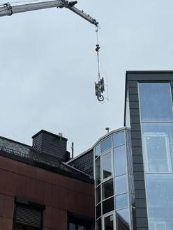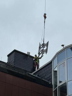 Die Montage der neuen Sirenen-Anlage in luftiger Höhe auf dem Rathausdach übernahm ein Spezialunternehmen mit Unterstützung eines Krans. Fotos: Thomas Lang