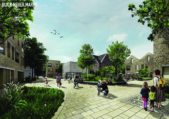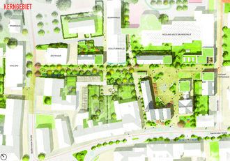 Die Schlösschen-Promenade ist als Allee mit Bäumen und hohem Grünanteil angedacht, wobei klimaresistente Bepflanzung die Aufenthaltsqualität steigern und gegen die Flächenversiegelung helfen soll. Die Promenade läuft auf das Schulzentrum zu und soll als Fußgängerzone insbesondere Familien und ältere Menschen ansprechen, zugleich aber auch Treffpunkt für Kinder und Jugendliche sein. Der derzeitige Parkplatz neben dem Schlösschen, könnte als „Neuer Markt“ eine vollkommen neue Nutzung erfahren und viele verschiedene Aspekte vereinen. So könnten Grünflächen mit Sitzgelegenheiten, gastronomische Angebote und ein Bereich mit Wasserfontänen zum Aufenthalt an der frischen Luft einladen. Angrenzende, neue Gebäude könnten wiederum Platz für Arztpraxen, Büroräume und Wohnungen bieten und gleichzeitig den Marktcharakter durch ihre Fassaden unterstreichen. Um für Anwohner und Gäste ausreichenden Parkraum vorzuhalten, sieht das Konzept eine Tiefgarage mit rund 70 Stellplätzen vor, deren Zu- und Ausfahrt von der Schulstraße aus erfolgen könnte.
