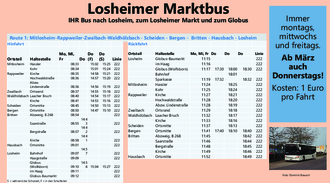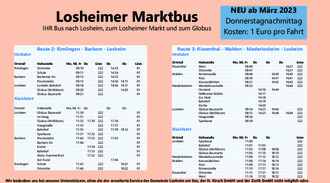 Seit 1999 gibt es in Losheim am See das Angebot, mit dem Marktbus von den einzelnen Ortsteilen montags und freitags zum Preis von 1 Euro pro Strecke in den Kernort Losheim und zum Globus Markt zu fahren. Seit August 2021 fährt der Bus auch am Mittwochvormittag. Nun ist dieses Angebot zusätzlich auch an einem Nachmittag möglich. Der Gemeinderat hat einstimmig beschlossen, das Angebot zu erweitern. Ab März 2023 fährt der Marktbus zusätzlich donnerstags. Damit wird das ÖPNV-Angebot in der gesamten Gemeinde Losheim am See optimiert. Gedacht ist der Marktbus für Menschen ohne Auto, die Arztbesuche oder Einkäufe in Losheim erledigen möchten. Aber auch Menschen mit Auto bietet der Marktbus die Möglichkeit, einmal mit dem Bus zu fahren und das Auto stehen zu lassen. So leisten wir alle einen kleinen Beitrag zur Reduzierung der Treibhausgase. Für den Fahrtpreis von 1 Euro lohnt sich eine Fahrt mit dem PKW erst gar nicht.