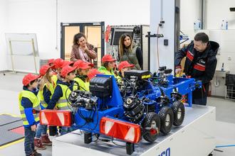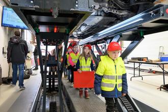 Der Rundgang startete mit einem Einblick in unsere KÜS-Prüfstelle (KÜLO). Dort durften die Kinder hautnah miterleben, wie eine Hauptuntersuchung durchgeführt wird und konnten den Experten bei ihrer Arbeit über die Schulter schauen. Die Kinder bekamen die einzelnen Schritte von den Mitarbeitern erklärt, denen sie interessiert folgten und Fragen stellten. Spannend ging es direkt im Anschluss weiter – mit Antonio Andreacchi: Der Leiter der KÜS Akademie nahm die neugierigen Gäste mit auf einen spannenden Rundgang durch das neu errichtete Akademie- und Forschungsgebäude. Dort erhielten sie einen faszinierenden Einblick in die Welt der Technik und die verschiedenen Ausbildungsbereiche. Die imposante Technologie von Lastkraftwagen wurde erklärt und die Kinder nutzten die Gelegenheit, diese sogar von unten zu betrachten. Ein weiteres besonderes Highlight war die Präsentation des Forschungsprojekts KÜS DRIVE mit einem Einblick in die Zukunft der Fahrzeugüberprüfung. Diese interaktive Vorstellung begeisterte die kleinen Besucher und weckte ihr Interesse an innovativer Technologie.