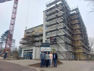 „Unsere großzügigen Bewohnerzimmer erhalten bodentiefe Fenster mit Verschattungsanlagen. Durch diese modernen Fensteranlagen ist es den Bewohnern möglich auch im Sitzen einen weiten Blick aus dem Fenster zu genießen. Ein variabler Sichtschutz auf der Innenseite sorgt wiederum für Privatsphäre bei zugleich hellen, freundlichen Räumen dank großer Fenster“, berichtet Geschäftsführer und Inhaber Thomas Hüllein beim Besuch des Bürgermeisters Helmut Harth. „Jeder Wohnbereich erhält einen eigenen, großzügigen Balkon, der direkt an die Aufenthaltsräume der Bewohner angeschlossen ist. Diese Aufenthaltsbereiche werden durch große Fensterfronten modern und lichtdurchflutet gestaltet und bieten direkten Zugang zu den an der Südseite gelegenen neuen Balkonen. Hier können die Bewohner bereits im Frühjahr die Sonne genießen.“
