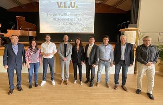 Von links: Helmut Harth (Bürgermeister Losheim am See), Ricarda Jarolimeck (Saariv Attractive), Matthias Bruch (Geschäftsführender Gesellschafter der Globus Markthallen Holding), Julian Heinz (Vorstand V.L.U.), Christina Jochum (Wirtschaftsfördererin der Gemeinde Losheim am See), Kai Seiwert (V.L.U.-Sprecher), Dr. Felix Flesch (VinVin), Michael Wagner (stv. Ortsvorsteher Ortsteil Losheim), Dirk Langer (Vorstandsmitglied V.L.U.) freuten sich über interessante Vorträge und gute Gespräche beim 2. V.L.U.-Sonntag im Losheimer Saalbau.