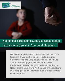 Die Ehrenamtsbörse des Landkreises Merzig-Wadern und der Landessportverband für das Saarland laden Ehrenamtliche und Vereinsvertreter am Samstag, 6. September, zu einer kostenlosen Fortbildung im Themenbereich Schutz vor Gewalt im Sport ein. Die Veranstaltung findet im großen Sitzungssaal des Landratsamtes, Bahnhofstraße 44 in Merzig, statt.