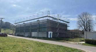 Die Arbeiten sollen bis Juni 2025 abgeschlossen sein. Trotz der Einhausung im Rahmen der Sanierungsarbeiten kann der Hallenbetrieb weiterhin stattfinden.