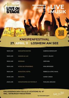 Live-Musik-Fans können sich auf ein außergewöhnliches Konzerterlebnis freuen, wenn am 27. April in Losheim am Stausee 7 Lokale zur Bühne für regionale und überregionale Bands und Solokünstler werden. Die Bands spielen an folgenden Locations: Seehotel, Wohlfühlhotel, Seespass, Kiosk am Strandbad, Seegarten Bistro, Maison au Lac und Heimathafen (im Festzelt).