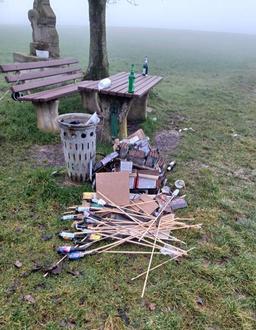 Keine besonders erfreuliche Neujahrsüberraschung fanden Spaziergänger am 3. Januar am Hantenkreuz auf der Wahlener Platte vor. Offensichtlich hatte man das neue Jahr mit einem feucht-fröhlichen Feuerwerk begrüßt, dann jedoch die Überreste der Feierlichkeiten einfach an der Ruhebank liegengelassen. Der Ortsvorsteher informierte den Baubetriebshof, der die Hinterlassenschaften ordnungsgemäß entsorgte - einmal mehr auf Kosten der Allgemeinheit.