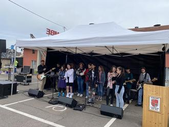 Die Schulband der Peter-Dewes-Gemeinschaftsschule begeisterte bei einem einstündigen Auftritt mit mitreißender Musik und einer energiegeladenen Performance das Publikum vor der Bühne.
