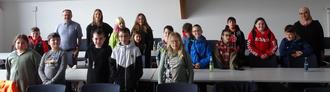 Der Bürgermeister Helmut Harth empfing zunächst eine der beiden Klassen, die zweite kam eine Stunde später vorbei. Im 3. Stock im Sitzungssaal durften die Kinder dort Platz nehmen, wo in der Regel die Gemeinderatsmitglieder sitzen und bei Apfelschorle und Sprudel den Bürgermeister mit Fragen löchern. Neben persönlichen Fragen, wollten diese z.B. wissen wie viel Geld die Gemeinde im Jahr ausgeben darf, wie viele Menschen bei der Gemeinde arbeiten und welche Voraussetzungen man benötigt, um Bürgermeister zu werden. Auch waren alle sehr daran interessiert, wann das alte Schulgebäude in Wahlen abgerissen und mit dem Neubau begonnen wird. Nachdem alle Fragen beantwortet waren erfolgte jeweils das Gruppenfoto.