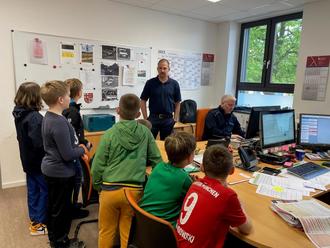 Auch die Mitarbeiter*innen der Ortspolizeibehörde, Pascal Lang, Uschi Wolter, Christian Müller und Klaus Weis berichteten von ihrem Tagesablauf. Sie kontrollieren z.B. die Parkplätze und stellen den Blitzer auf (hier konnten einige Kinder berichten, dass Ihre Eltern schon öfter geblitzt wurden).