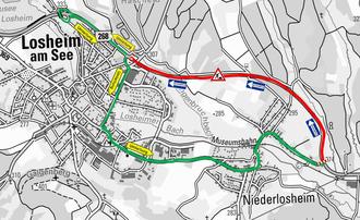 Die Umleitungen sind ausgeschildert. Die vorhandenen Fahrbegrenzungen bis 7,5 Tonnen in der „Saarbrücker Straße“ und der „Niederlosheimer Straße“ werden für die gesamte Bauzeit aufgehoben.