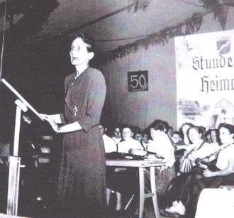 Natalie Zimmermann bei ihrem Vortrag am Heimatabend 1953 in Losheim zusammen mit dem Mandolinenorchester Losheim