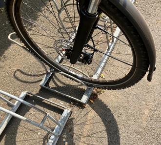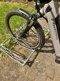 Fahrradbügel oder Vorderrad-Rahmenhalter erfüllen diese Kriterien am besten. Hier kann der Rahmen an einer Stange angelehnt und das Laufrad fixiert werden. Idealerweise sollte außerdem ein Schutz vorhanden sein, damit beim Anlehnen keine Lackschäden entstehen.