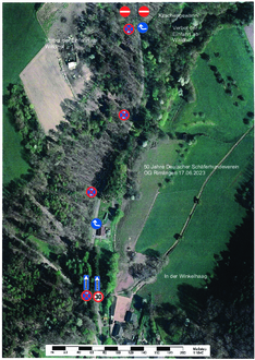 Die Rimlinger Straße wird ab dem Feldweg „In der Winkelhaag“ (zwischen Anwesen „Rimlinger Straße 114“ und dem Hundeplatz) in Fahrtrichtung Losheim bis zum Waldhof zur Einbahnstraße (VZ 220) erklärt. Die Abfahrt der Besucher der Veranstaltung erfolgt in Fahrtrichtung Losheim. Auf einer Teilstrecke (Feldweg „In der Winkelhaag“ bis Höhe Feldweg „Kirschengewann“) wird linksseitig ein absolutes Halteverbot (VZ 283-10, 283-20, 283-30) angeordnet. Die Geschwindigkeit wird in diesem Bereich auf 30 km/h festgesetzt. Vom Parkplatz des Hundeplatzes und vom Feldweg „Kirschengewann“ gilt die vorgeschriebene Fahrtrichtung rechts (VZ 209).